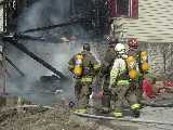 Local 627 member Shawn Caruso provides the photos of a three-alarm fire in York City at 222 through 226 Prospect Street on Saturday, February 26, 2005. The fire damaged five row homes. One member of Local 627 was transported to York Hospital where he was treated for a severely bruised shoulder and released. Click on the thumbnail photos to view a larger image.
